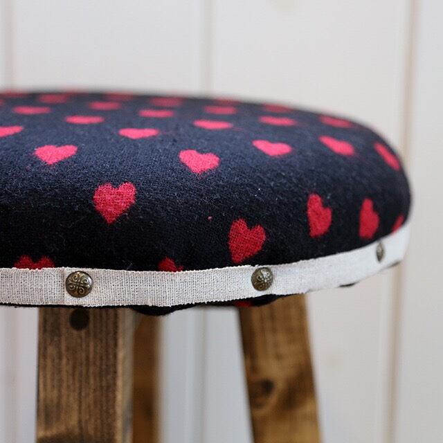 ・ブラック地にレッドのハートのドットが入った生地を使ったちょっとレトロ・アンティークな雰囲気のウッドスツールです。