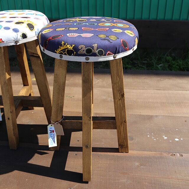 ・ネイビー地にユニークなメガネのイラストが入った生地を使ったちょっとレトロ・ポップな雰囲気のウッドスツールです。