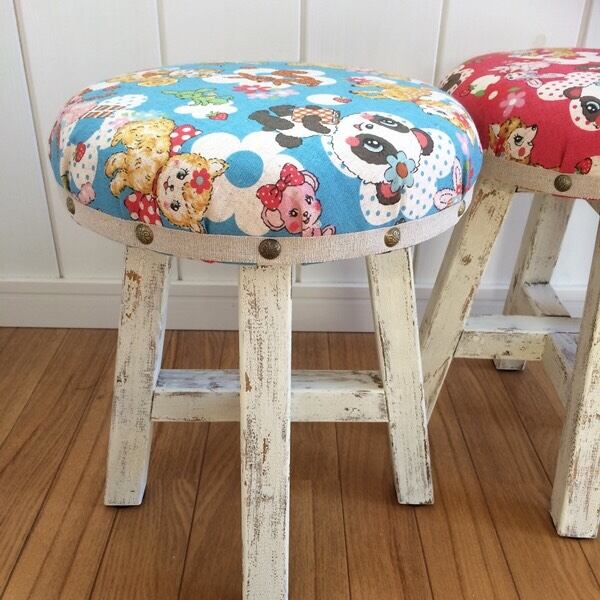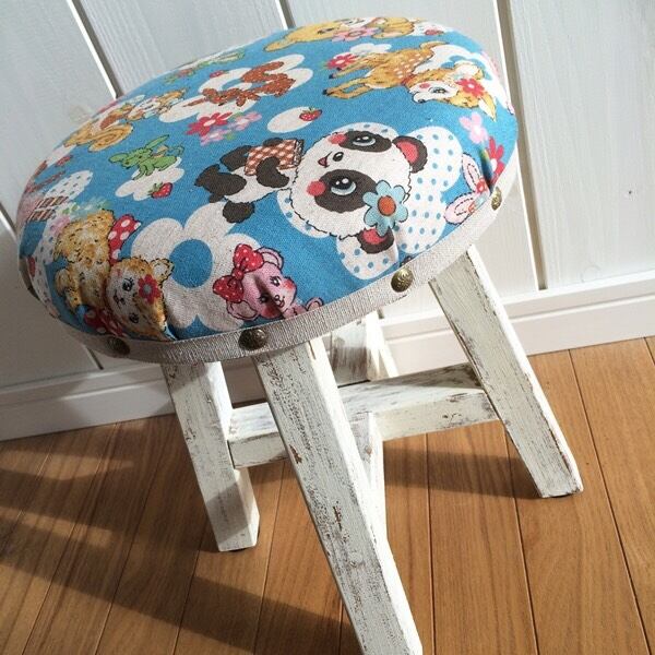 ・かわいいアニマルキャラクター柄の生地を使ったカントリー調の子供用ミニウッドスツールです。