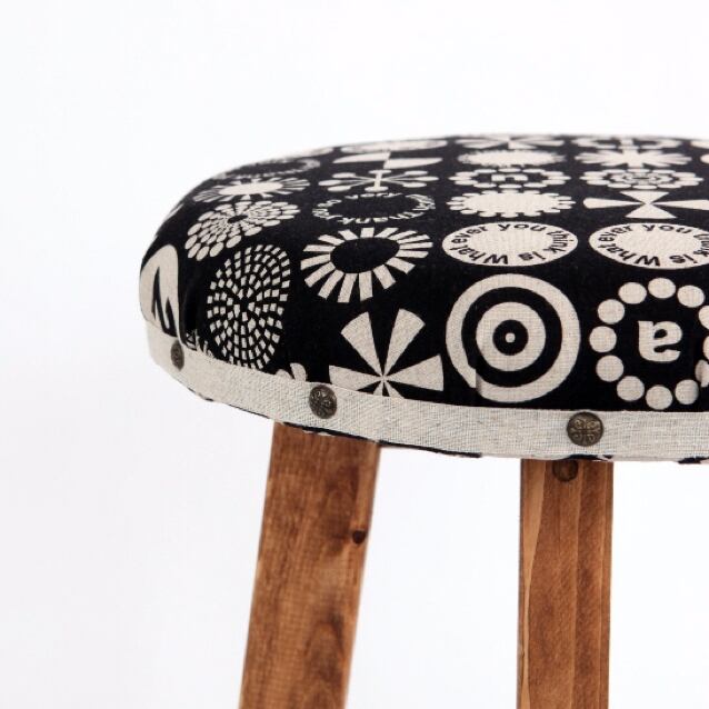 ・ブラック地にいろいろなサークル上のデザインが入った生地を使ったちょっとアンティークな雰囲気のウッドスツールです。
