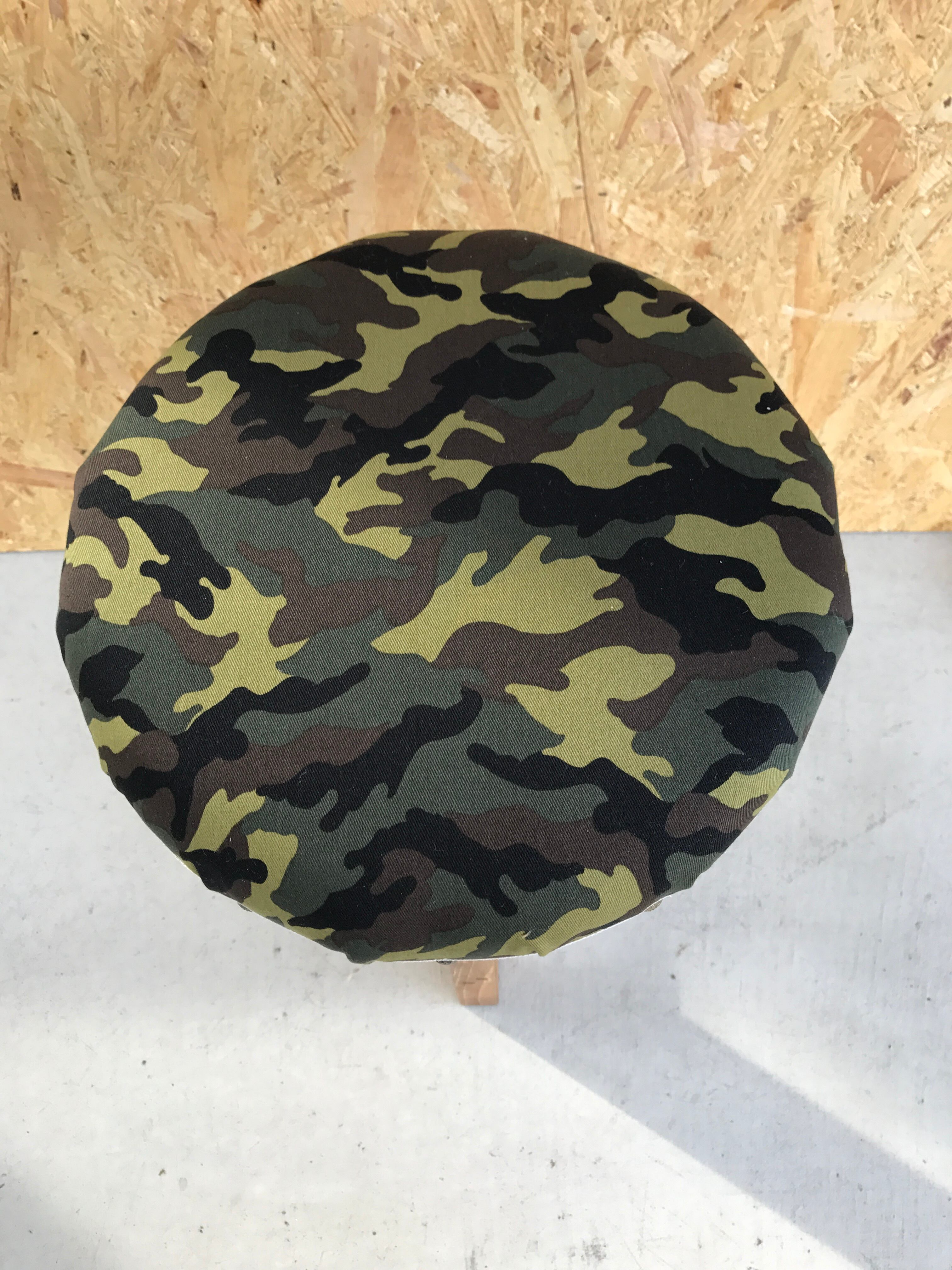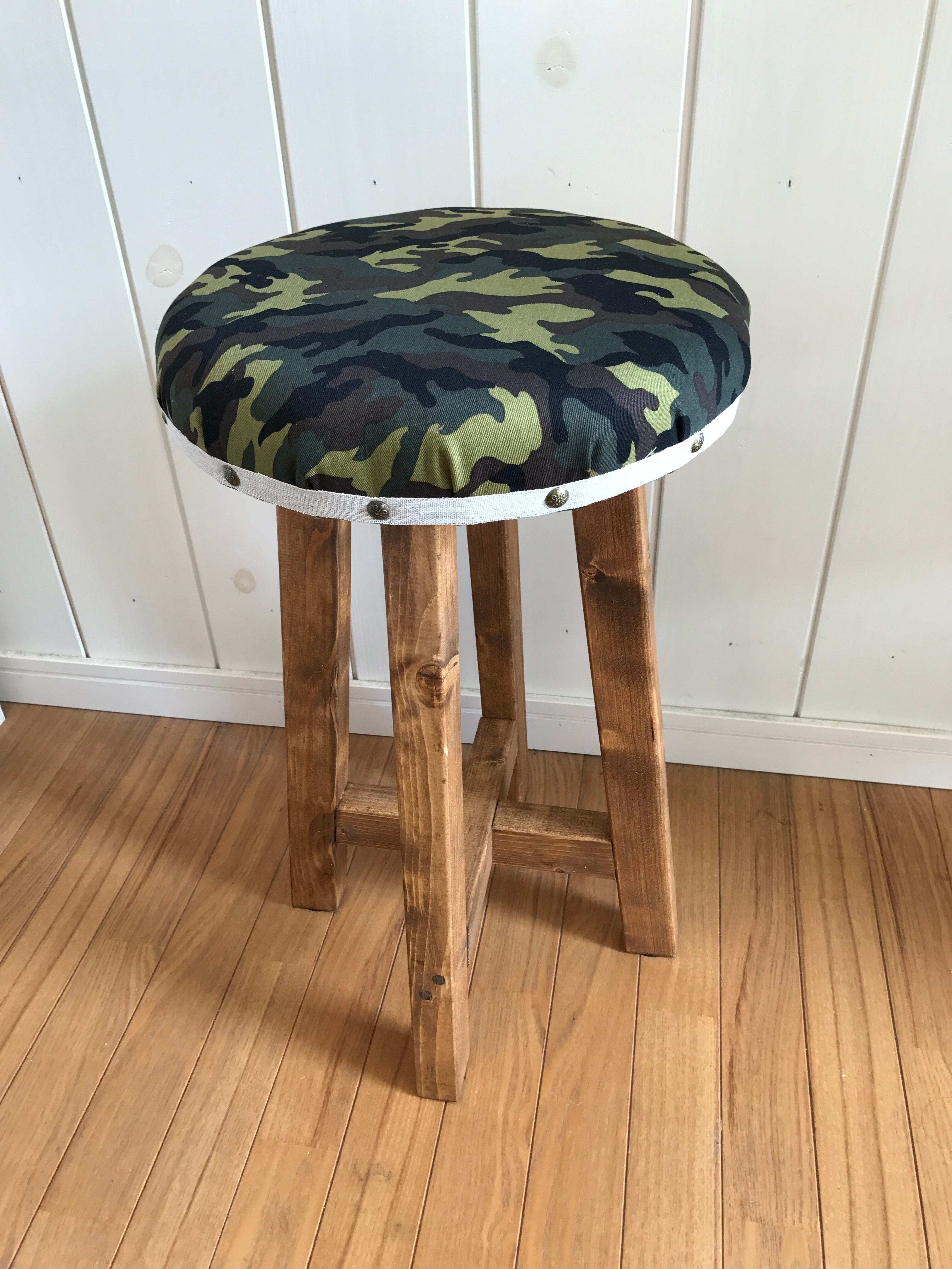 ・座面にはグリーン系の迷彩柄の生地を使用しております。ちょっとアンティークな雰囲気のウッドスツールです。